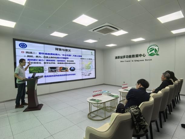 在清原森林站学术报告厅,于立忠向调研组详细汇报了清原森林站的建站背景、定位方向、长期观测/研究成果、团队建设,以及未来发展规划等;在信息化站史馆,调研组借助3D全息数字沙盘、智能讲解人等全面了解了清原森林站的发展历程、科研样地、科研平台(如科尔塔群等)和重要科研设施;在多功能数据中心,高添重点介绍了依托院网信项目建设的森林三维结构监测、碳汇智能监测、森林生物资源全链监测等平台系统,以及在数据采集、分析、可视化等方面的应用成效。最后,调研组一行实地考察了清原科尔塔群、科研样地群、森林流域水文观测站网等科研平台,详细调研了森林生态系统结构监测、碳通量观测、水文过程观测等。